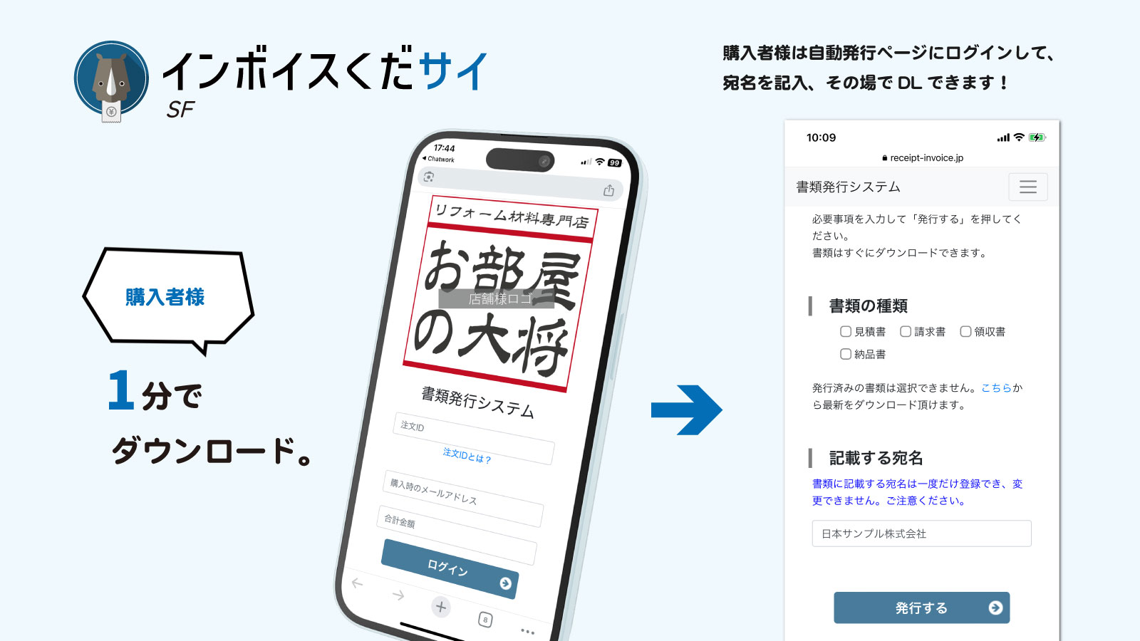 必須の初期設定はありません。店舗様は書類発行ページURLをコピペして購入者様にご案内下さい。